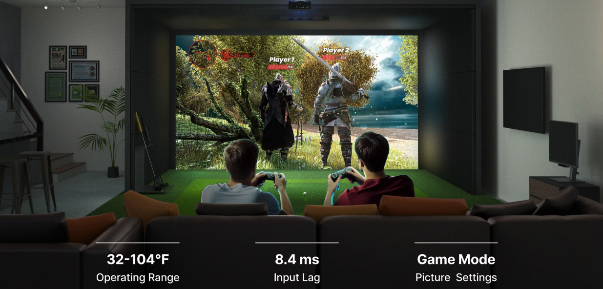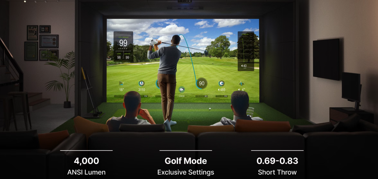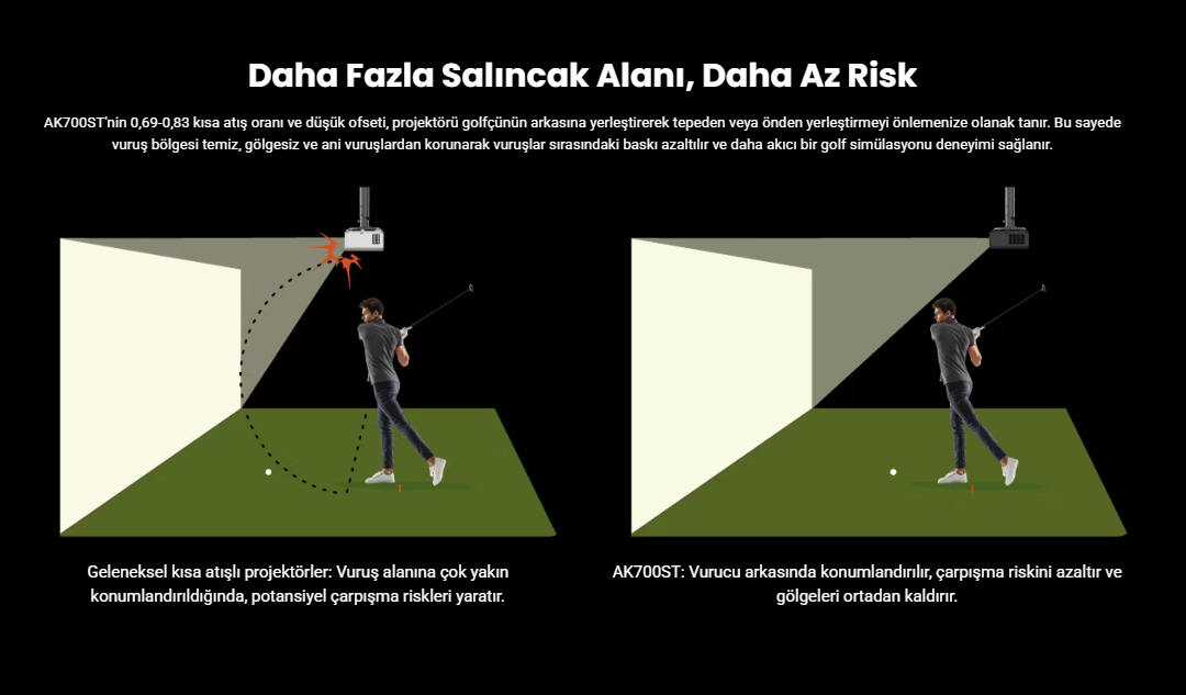 AK700ST'nin 0,69-0,83 kısa atış oranı ve düşük ofseti, projektörü golfçünün arkasına yerleştirerek tepeden veya önden yerleştirmeyi önlemenize olanak tanır. Bu sayede vuruş bölgesi temiz, gölgesiz ve ani vuruşlardan korunarak vuruşlar sırasındaki baskı azaltılır ve daha akıcı bir golf simülasyonu deneyimi sağlanır.
