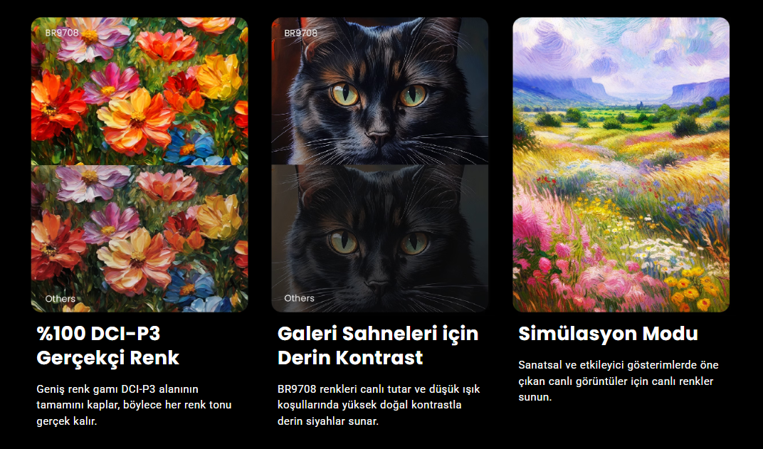 %100 DCI-P3 gamı ve galeriye hazır Simülasyon Modu ile BR9708, sergi aydınlatmasında renkleri canlı tutarken, ultra siyah optikler karanlık alanlarda ince ayrıntıları ortaya çıkarır. Her ünite, çoklu projektör karışımları için ideal olan ΔE < 2'de doğrulanmış çizgiyi bırakır.