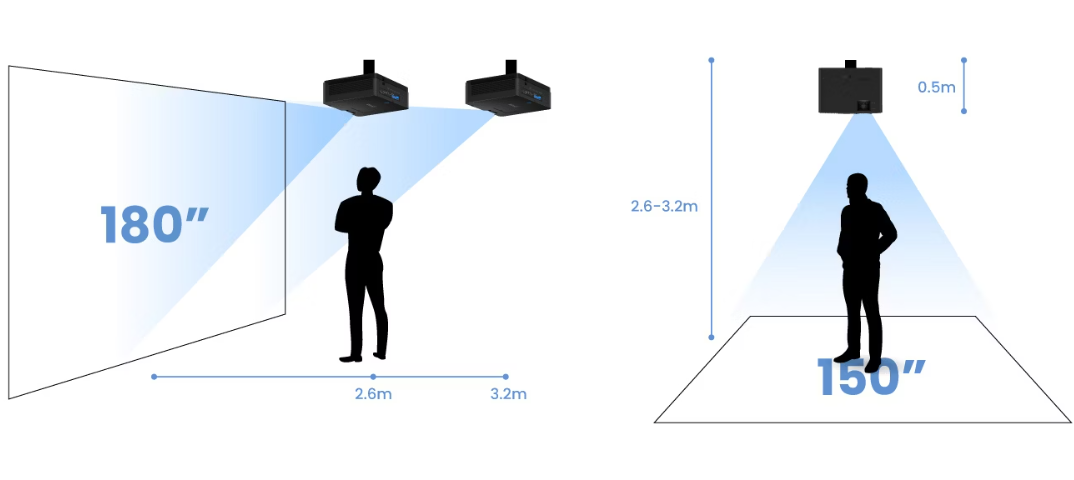 0,69 Kısa Atış Oranı ve 1,2x Yakınlaştırma - Kapalı alanda etkileşimli eğlence ve spor aktiviteleri için ideal olan LH600ST, yalnızca 2,7 metre mesafede 180 inçten daha büyük görüntüler yansıtır. Kısa mesafeli projeksiyonu, insanların veya nesnelerin araya girmesini ve yansıtılan görüntüye gölge düşürmesini önleyerek mümkün olan en sürükleyici izleme deneyimini sağlar.