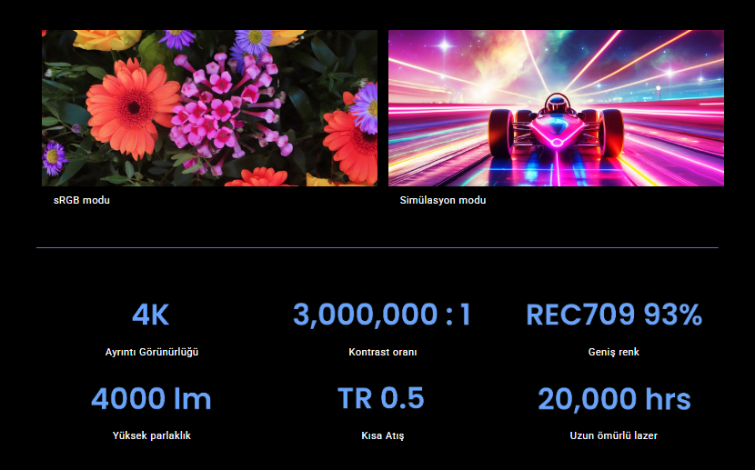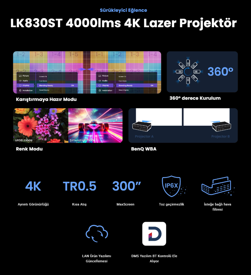 LK830ST, canlı Rec.709 renklerinden ve yüksek kontrasttan 4000 lümen parlaklığa ve 20.000 saatlik lazer ömrüne kadar her ayrıntıda mükemmel görüntü netliği ve istikrarlı performans sunar.