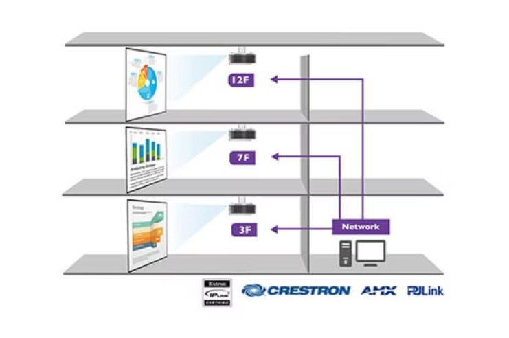 LU785, LAN aracılığıyla ağ kontrolü için Extron, Crestron, AMX ve PJ-Link gibi önde gelen projektör kontrol sistemleriyle tam olarak uyumludur ve kurumsal ağ altyapılarına entegrasyonu kolaydır. LU785, LAN altyapısının mevcut olmadığı durumlarda, 15 metreye kadar güvenilir uzun mesafeli kurulumlar için RS-232 bağlantısını da destekler.