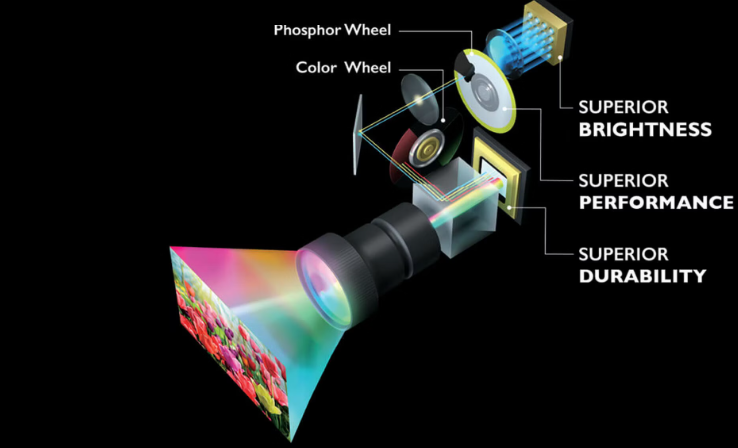 Hava Almayacak Şekilde Kapalı DLP Yongası; Renk tekeri üzerinden saf ışığı yansıtan iki milyondan fazla mikro aynadan oluşan DLP yongası, bozulma olmadan 100.000 saatin üzerindeki ısıya direnmek için hava almayacak şekilde kapatılmıştır.