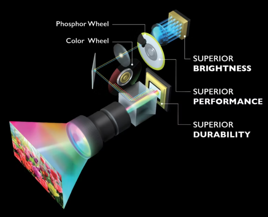 Renk çarkı aracılığıyla saf ışığı yansıtan iki milyondan fazla mikro aynadan oluşan DLP çipi, 200.000 saatten fazla süre boyunca bozulmadan ısıya dayanacak şekilde hava geçirmez şekilde kapatılmıştır.