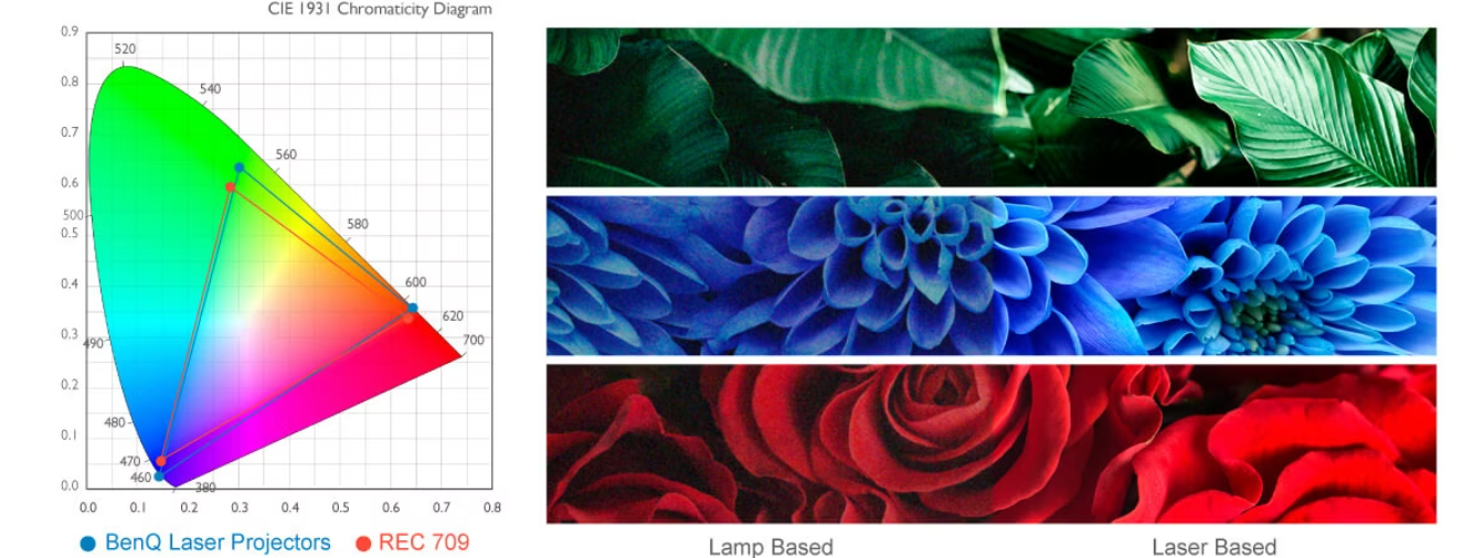 Güçlü lazer ışık kaynağının yüksek çıkışından yararlanmak için BenQ mühendisleri, lazer projektörler için çift renk tekerleği kullanarak geleneksel bir renk tekerleğinin beyaz bölümünü ortadan kaldırarak lazer hassasiyetinde RGBY rengine önemli ölçüde ulaştı. Kırmızı, yeşil, mavi ve sarı renk dilimlerinin ideal bir karışımı sayesinde BenQ lazer projektörler, geleneksel lamba tabanlı projektörlere göre parlak renkler ve daha geniş bir renk gamı üretir.