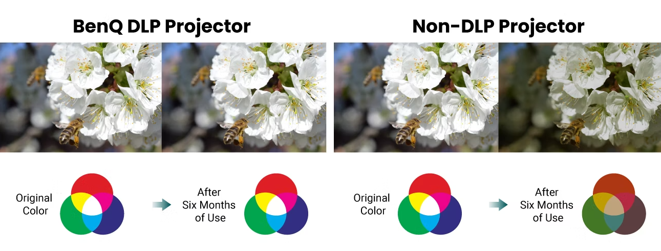 Endüstriyel sınıf dayanıklılık DLP teknolojisiyle BenQ eğitim projektörleri, renk bozulması olmadan uzun süreli görüntü mükemmelliğini korur. DLP olmayan projektörlerin aksine, BenQ DLP eğitim projektörleri, uzun bir projektör ömrü boyunca yepyeni gibi kalan görsel kalite sunar. İki milyondan fazla mikro ayna ve minimum ısı birikimiyle, BenQ tarafından kullanılan DLP çipi 100.000 saatten fazla bozulmadan dayanır.