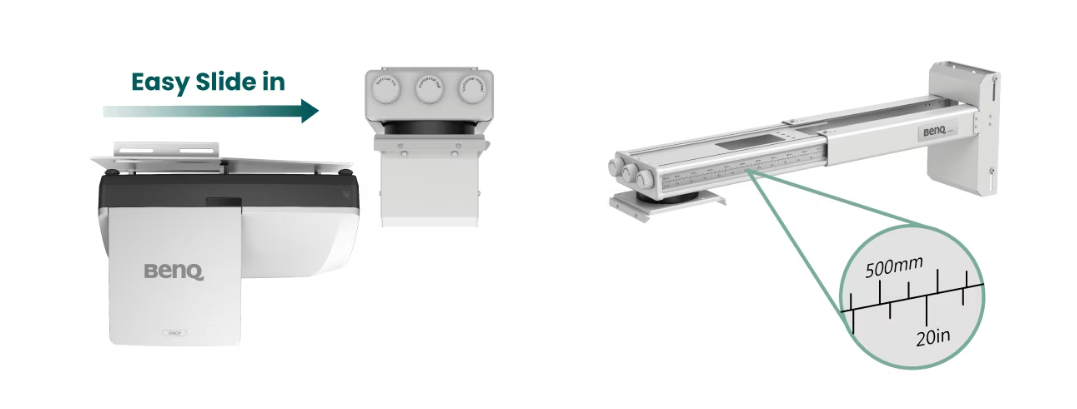 Kolaylaştırılmış Duvar Montajı Hizalaması Verimli ve profesyonel bir kurulum için LW855UST ultra kısa mesafeli projektör duvar montajı, sınıfta mükemmel ekran hizalaması ve görüntü konumlandırması sağlayan bir kurulum şeması ve cetvel ile donatılmıştır. İşleri daha da kolaylaştırmak için, projektörün ön tarafında temiz bir şekilde monte edilmiş, tamamen kare ekranlar için üç yönlü bir ayar düğmesi bulunur.