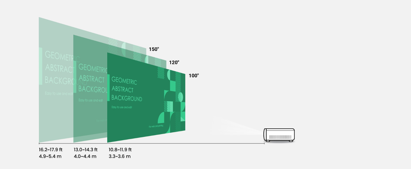 Sadece 3m~4m uzaklıktan 100"ten daha büyük görüntüleri yansıtın (1,1X yakınlaştırma yoluyla), böylece her boyuttaki odada büyük ekranda kolayca görüntüleme yapabilirsiniz.