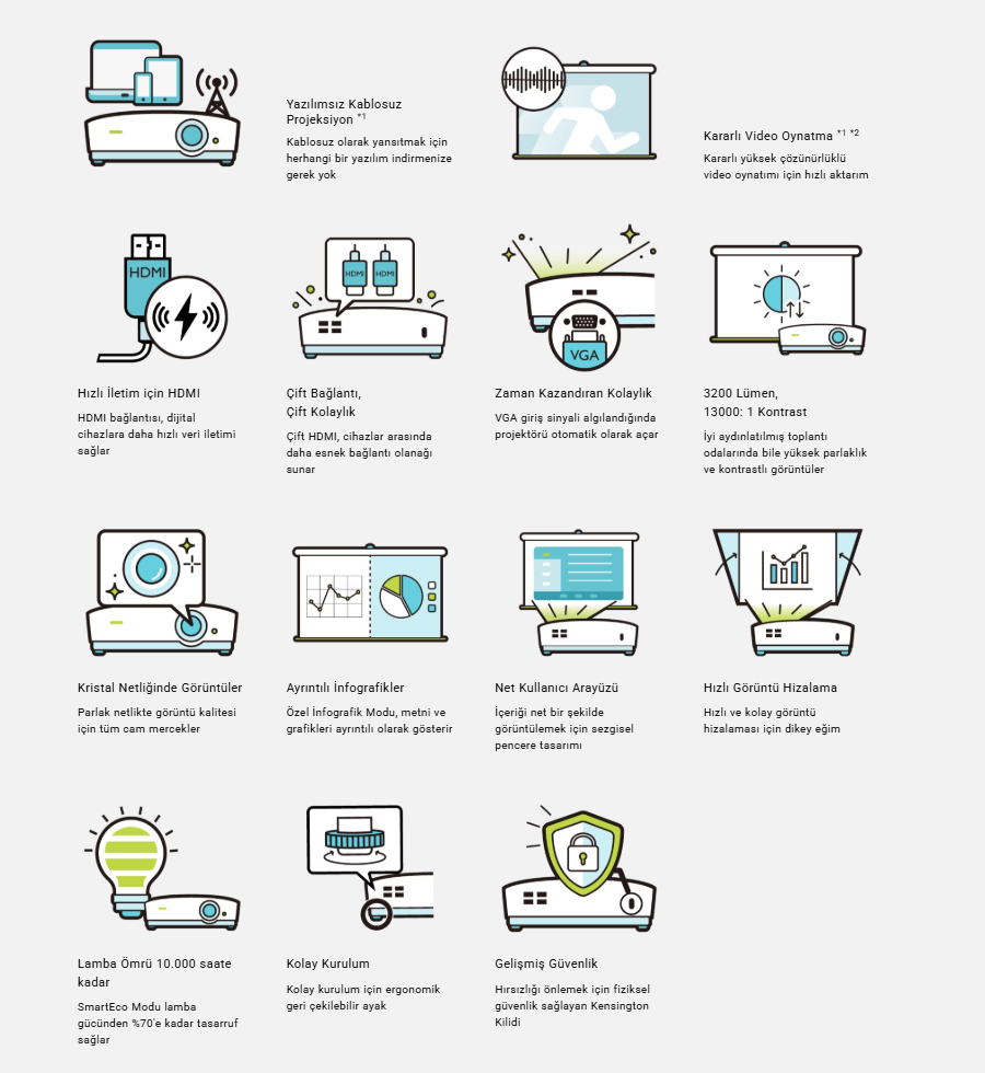 - 3200 ANSI Lümen Yüksek parlaklık ve 13.000:1 Yüksek Kontrast