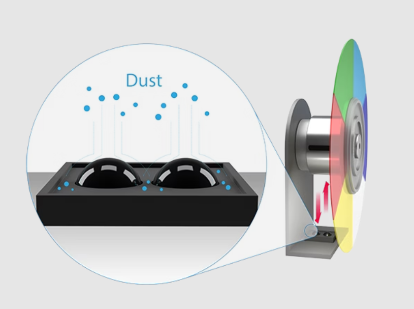 Toz Birikimi Önleyici Sensör Toz Birikimini Önler - Toz birikmesini önleyen akıllı bir özelliğe sahip renk tekerleği sensörlerini bünyesinde barındıran MW809STH, geleneksel sensörlerde birikerek IR sinyalini engelleyebilen ve titremeye, anormal renklere veya hatta kapanmaya neden olabilen tozu reddederek optimum performansı uzatır.