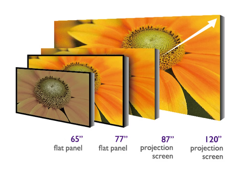 Daha Büyük Görüntüler - BenQ eğitim projektörleri, farklı sınıf ihtiyaçlarını karşılamak için çeşitli çözünürlükler ve yansıtılan görüntü boyutları sunar. 120 inçe kadar net görüntü kalitesi sunan ultra kısa mesafeli eğitim projektörlerimiz, düşük maliyetlerle daha fazla sınıf çok yönlülüğü sunar.