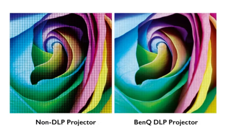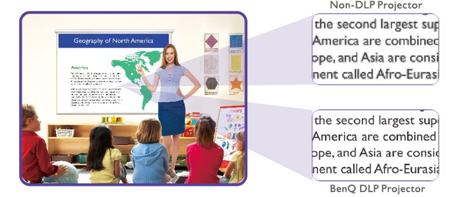 BenQ DLP projektörler, her pikselin etrafındaki siyah çerçeveleri en aza indirerek sınıfının en yüksek dolgu faktörüne sahiptir ve DLP olmayan projektörlerde sıklıkla görülen korkulan "ekran kapısı efekti"ni ortadan kaldırır. BenQ eğitim projektörleri, pikselli grafikler yerine güzelce işlenmiş görüntüler için küçük boyutlu metinlerde ve ince ayrıntılarda üstün çözünürlük ve netlik sunar.