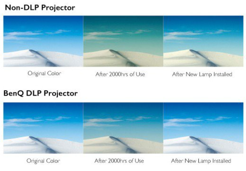 Uzun Ömürlü Görüntü Kalitesi - DLP çipini toz kaynaklı görüntü bozulmasından koruyan sızdırmaz tasarımı ve DLP projeksiyon teknolojisinin endüstriyel düzeydeki dayanıklılığı sayesinde BenQ eğitim projektörleri, renk bozulmasını ortadan kaldırarak uzun süreli görüntü kalitesini koruyabilir. DLP olmayan projektörlerin aksine, BenQ eğitim projektörleri, lamba değişiminden sonra yepyeni projektörlerle aynı kalitede birinci sınıf görüntü kalitesi sunar.