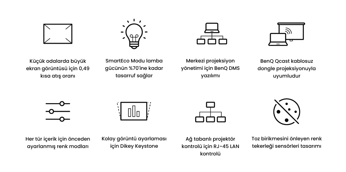 Üstün Kontrast - DLP teknolojisi, her pikselin etrafındaki siyah sınırları en aza indirerek, küçük boyutlu metinlerde ve ince ayrıntılarda üstün çözünürlük ve netlik sağlayan, sınıfının lideri yüksek dolgu faktörüne sahiptir.