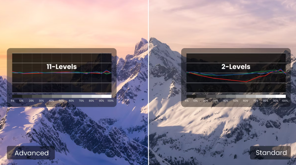 BenQ'nun üst düzey sinema projektörleri, en üst düzey renk doğruluğu için parlaklık aralığında 11 seviyeli beyaz dengesi kontrolüyle gelişmiş renk sıcaklığı ayarı sunarak, içerik meraklılarının orta tonlu renkleri hassas bir şekilde ince ayar yapmasına olanak tanır.
