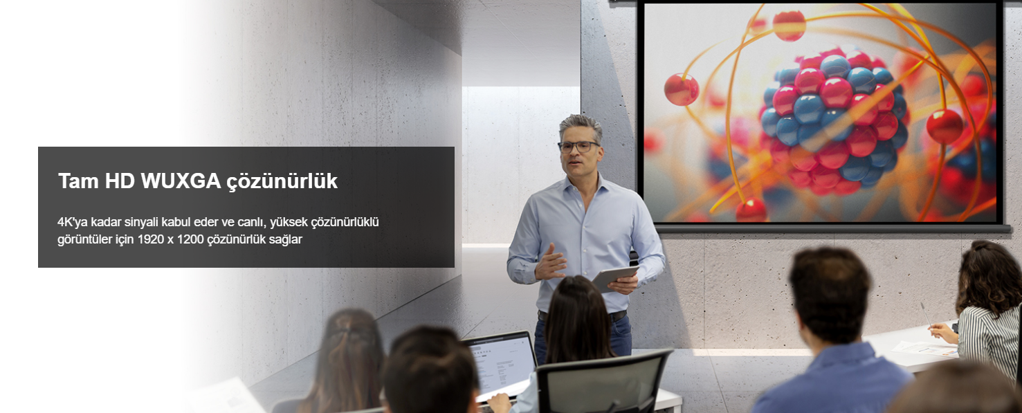 Tam HD WUXGA çözünürlük 4K'ya kadar sinyali kabul eder ve canlı, yüksek çözünürlüklü görüntüler için 1920 x 1200 çözünürlük sağlar