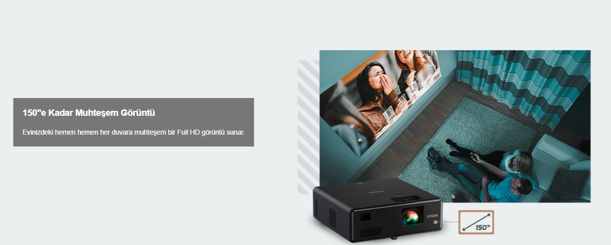Destansı Olun! Epson EpiqVision Mini EF11 Lazer Projektör ile neredeyse her yerde muhteşem bir izleme deneyiminin keyfini çıkarın. Dahili yüksek kaliteli hoparlör sistemiyle bu hepsi bir arada projektör, tüm favori yayın servislerinizi izlemenin mükemmel bir yoludur. Apple TV®, Roku, Amazon Fire TV veya Android TV gibi tercih ettiğiniz yayın çözümünü dahili HDMI® bağlantı noktasına bağlayın ve en sevdiğiniz içerikleri 150 inç'e kadar muhteşem bir ekrana aktarmaya hazır olun . Epson EpiqVision Mini EF11 Lazer Projektör, en sevdiğiniz içerikleri evinizin herhangi bir yerinde izlemenin karmaşıklığını ortadan kaldırır.