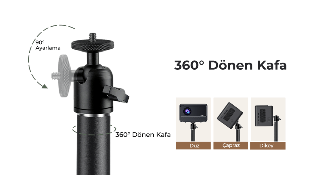 Bu projektör standı geniş bir açı aralığı sunar. Bu, yatayda 360° dönebilen ve 90° eğilebilen bir dönüş kafasına sahiptir, böylece stabil ve güvenilir bir projeksiyon sağlanır. (Not: Yalnızca alt kısmında 6mm'lik merkez vida deliği olan projektörlerle uyumludur. Satın almadan önce lütfen doğrulayın.)