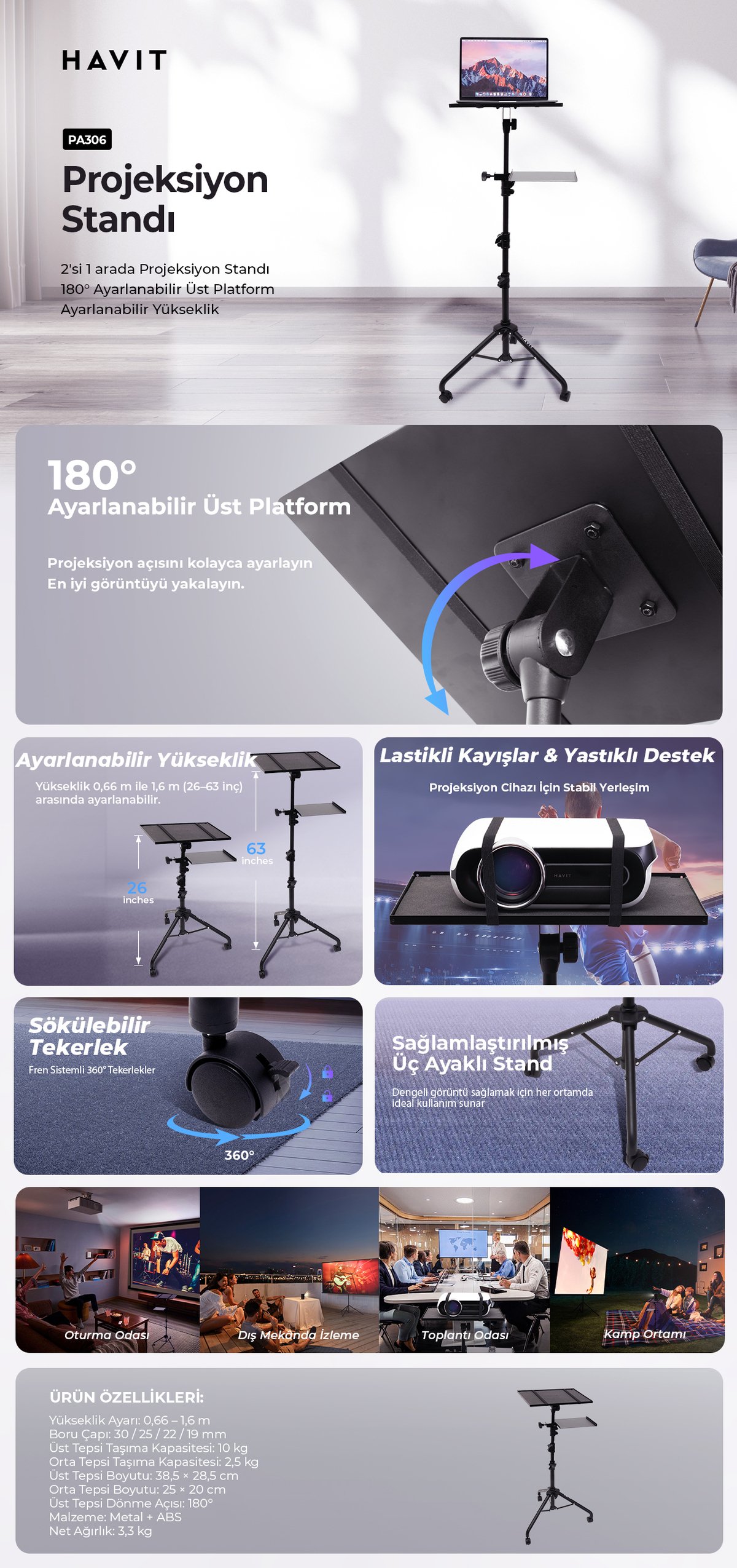 0,66 m’den 1,6 m’ye kadar yükseklik ayarı ve 180° dönebilen üst tepsi ile evde, ofiste veya kampta ideal projeksiyon deneyimi sunar.
