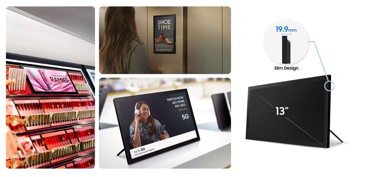 19,9 mm ile her zamankinden daha ince olan 13 inçlik kompakt ekran, dar alanlara kusursuz bir şekilde sığar ve performanstan ödün vermeden görünürlüğü en üst düzeye çıkarmak için mükemmeldir. Daha küçük tasarımı sayesinde, işletmelerin talep ettiği aynı güvenilir performansı sunarak her ortam için akıllı bir seçim haline gelir.