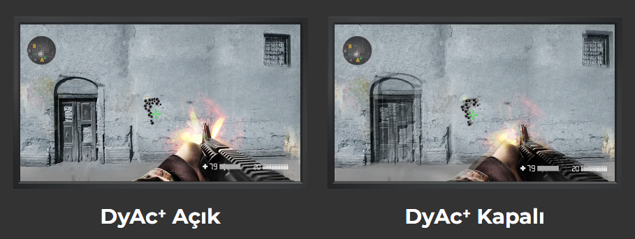 DyAc™, sprey sıkma gibi güçlü oyun içi hareketleri daha az bulanık hale getirir. Bu, oyuncuların nişangah ve çarpma noktalarının konumunu daha net görmelerini sağlayarak geri tepme kontrolüne yardımcı olur. DyAc⁺™ ise aynı teknolojiyi temel alır ve panel optimizasyonu sayesinde oyunculara sprey sıkma kontrolü gibi hareketler için farklı bir seçenek sunar.